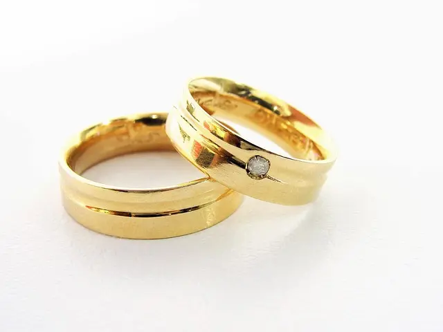 Juego de alianzas de casamiento de oro opaco con detalles en oro brillante y un brillante en la de la mujer